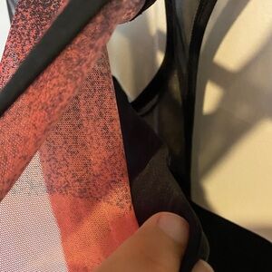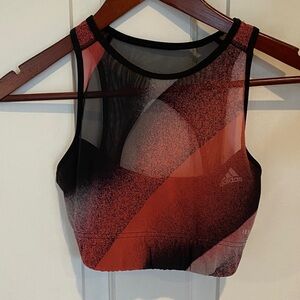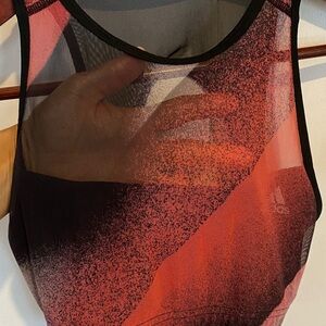 Dynamic sports bra with striking pink and black pattern. Breathable mesh design. Ideal for active wear.