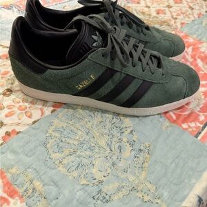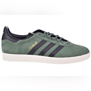 Stylish adidas sneakers. Green suede upper. Black stripes and accents. Comfortable and trendy.