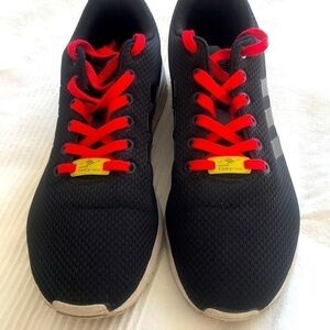 These adidas Originals ZX Flux sneakers are in good, pre-owned condition. Simple and modern, the ZX Flux is a descendant of the iconic ZX 8000 running shoe. These men's shoes have a one-piece mesh upper with welded TPU 3-Stripes. With styling inspired by the iconic mid-'80s ZX runner, these men's have a sleek woven upper, tonal laces and a molded heel cage. Some wear in sides and soles. Original black laces have been swapped for red - stock photos included to show style.