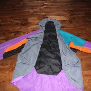 Vintage-looking Adidas windbreaker jacket. The size is large. It is grey, purple, orange, black, and turquoise. Brand new.