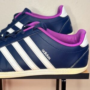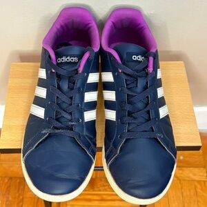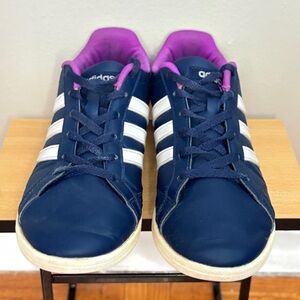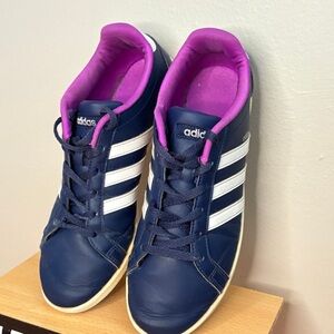 Stylish adidas athletic shoes. Navy exterior with purple accents. Comfortable and durable design.