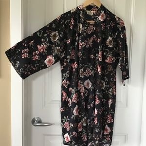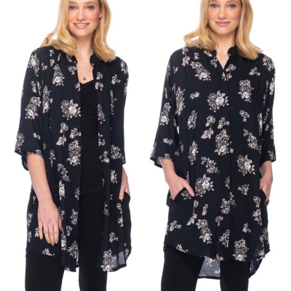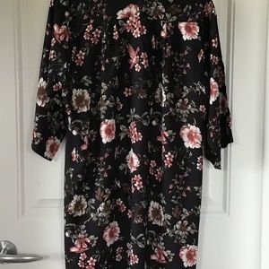 Beautiful duster … black with soft green and pink flowers and birds. 100% rayon. Side pockets. Buttons down the front. Slightly dropped shoulders. Made in India. fair and ethically traded. Stock photo is not exactly like item, but gives an idea of the duster. Wear alone or with shorts, jeans, or leggings.