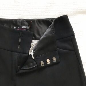ALICE + OLIVIA BLACK MID-RISE STRETCHY STRAIGHT LEG PANTS, A sleek, minimalist, classy, classic, timeless, versatile, formal, neutral solid deep black straight leg pants with a large waist band (3") - belt loops. Zipper fly with 3 clasp closure. 2 sided pockets on the front and 2 set-in pockets in the back. Low to mid rise depending on your body shape and tronck height (front rise: 8").Excellent condition. Perfect fora formal work / job / office business days outfit, with or without a blazer - to be matched with a classic white blouse or a colourful (fuschia pink - turquoise - coral ) vivid and vibrant top for a spring inspired outfit. Can also be worn for funeral, church or any formal important and serious events. Go to pants. Must have.