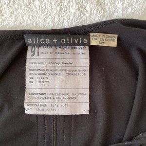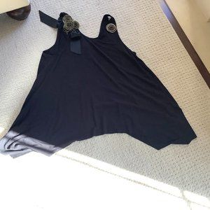 alice + olivia black sleeveless tunic/tank. 95% Rayon, 5% Spandex, feels and looks like really soft cotton knit. Shoulder details three swirled brass metal zipper trimflorets with black grosgrain ribbon on right shoulder and single brass swirl on left shoulder. Grosgrain ribbon trails over right shoulder to form a bow on back of shoulder. Perfect for clubbing nights or summer parties with white jeans or jeggings. Scalloped handkerchief hem reaches hips and dips down at side seams. Oversize armholes suitable for accompanying cami, bra, or bandeau. Centre hem-stitched back seam. Sexy and comfortable.