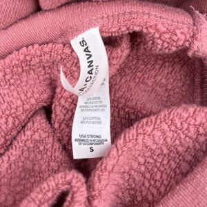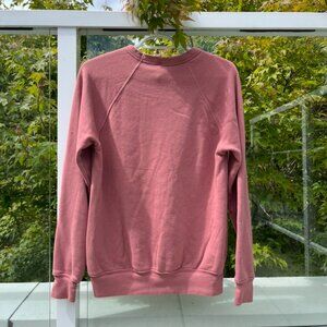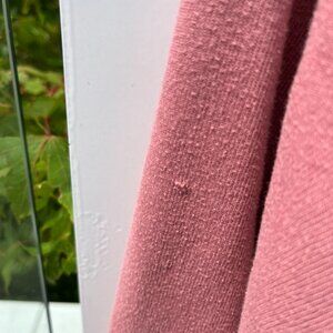 blush pink, lightly worn and has one small hole on the back of the left sleeve. adult size small