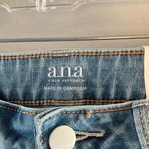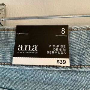 a.n.a. Midrise Bermuda 5 pocket jorts shorts, size 8. Mid/light wash. NWT. Only distressing is subtle- on pockets. Modest length. Finished hem- can cuff to adjust length. Perfectly on trend. 99% cotton, 1% spandex. Flat lay L 20”, W 15”, I 11”, 9” cuffed, 9” rise. jeanshorts #ana #casual.