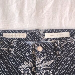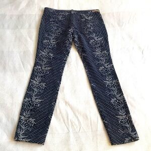 These Pilcro and the Letterpress Serif Corduroy pants from Anthropologie are in very good, pre-owned condition. They are skinny, jegging style. Micro corduroy denim material. 97% cotton/3% spandex. Dark navy with light gray dot and floral pattern. Faux front pockets, real back pockets, zipper and button, gold back tag and belt loops. Please see pics for measurements.