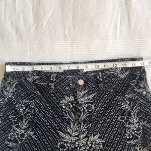 These Pilcro and the Letterpress Serif Corduroy pants from Anthropologie are in very good, pre-owned condition. They are skinny, jegging style. Micro corduroy denim material. 97% cotton/3% spandex. Dark navy with light gray dot and floral pattern. Faux front pockets, real back pockets, zipper and button, gold back tag and belt loops. Please see pics for measurements.