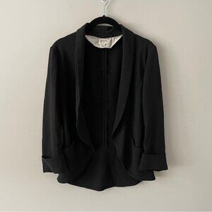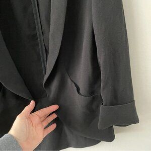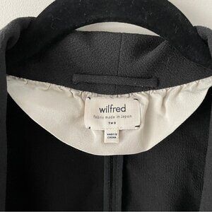 Aritzia Wilfred Chevalier Black Blazer 2. Used and in good condition. Slightly different then model in sleeve length. This is an open-front, drapey blazer with tacked, 3/4-length sleeves. It's made with textural, woven fabric from Japan with a nice weight.
