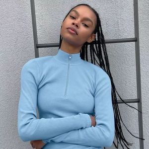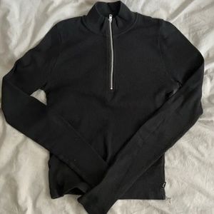 This is a half-zip longsleeve with a mock neckline. It’s made from soft, ribbed 100% cotton.