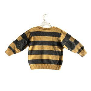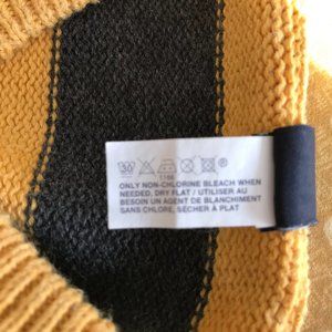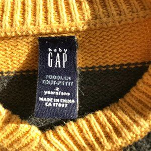 Pre-owned baby GAP toddler pullover sweater size 2years, 2T, 100% Cotton, V-neck in very good condition. Striped pattern grey and mustard yellow with corduroy elbow patches. Ribbed detailing on cuffs, neck, and hem. Chest width18 inch,. Length to neck 14 inch. Under arm sleve lenght 8 inch.