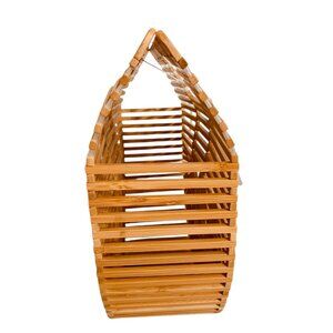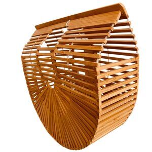 bamboo handbag. semi-circular shape with horizontal and radial bamboo slats. The bag has a handle at the top and an open top design. large tote bag suitable for beach use or for picnic . They are available in different sizes, with the large size measuring approximately 12.5" x 10.5" x 4". The Miuco bamboo bag is recognized for its stylish and unique design, often praised as a statement piece that enhances any outfit.