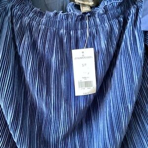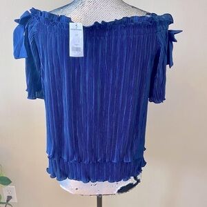 Stunning Sapphire blue pleated blouse from Banana Republic! Women’s size small. Blouse is NEW WITH TAGS. Festuring a flowy satin fabric, layered hem, off shoulder style (can be worn in multiple shoulder positions)