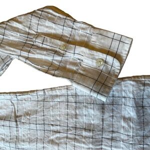 New without tags, long sleeve, white cotton with thin black plaid like pattern. Size large, see measurements, full button up with buttons on side cuffs.