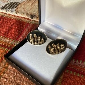 One set barbershop, Quartet cufflinks. Raised gold style on black background. Very unique. Great for office Christmas parties or any special occasion. Why not Stand out and Embrace permanent style!
