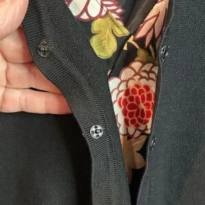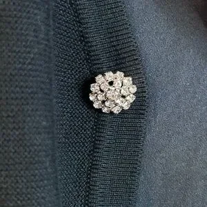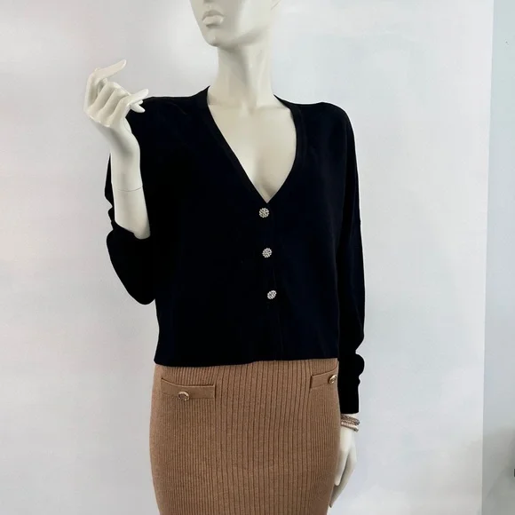 Simplicity and luxury meet in this beautiful cardigan starting with a flat, lightweight Santana knit in a black wool right down to the rhinestone encrusted buttons over snaps on the front.