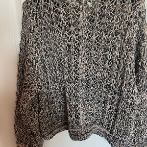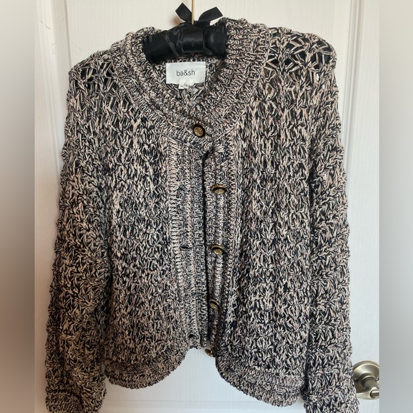 Chunky knit cardigan with button closure. Features a cozy, textured design. Perfect for layering.