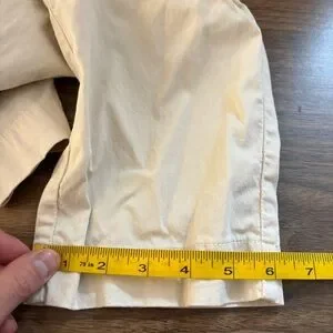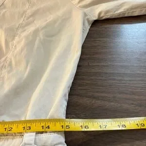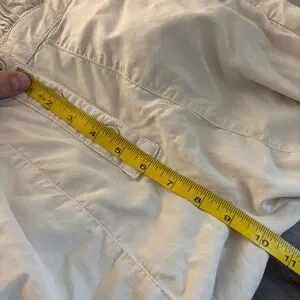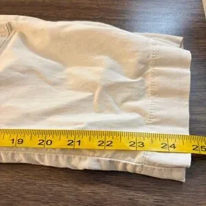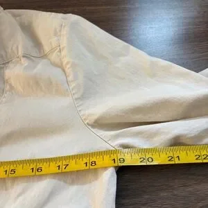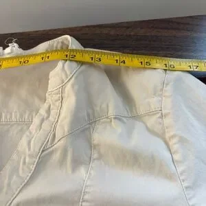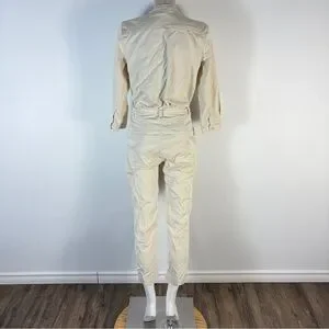 Stylish off-white jumpsuit with button-front design. Features a tie waist and three-quarter sleeves.
