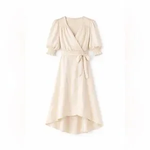 Lightweight wrap dress with a V-neck. Puff elbow sleeves and a tie waist. Flowing high-low skirt for gentle movement. Minimalist and refined for versatile wear.