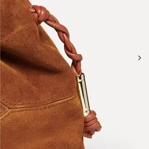 Soft tan suede body with a ruched top. Thin adjustable shoulder strap. Subtle silver hardware accents. Casual yet refined look for daily wear.