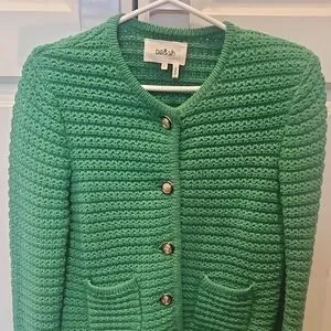 Chic green cardigan with textured knit. Features button closure and front pockets. Ideal for layering.