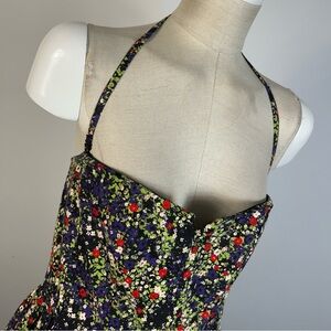 Chic mini dress with colorful floral design. Features a stylish halter neckline. Ideal for any occasion.
