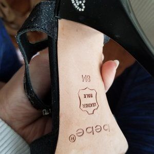 bebe black evening high heels. It's a fabric top with sparkles, but leather sole. The shape is simply beautiful. I'm a size 7, therefore, they are a bit big on me.