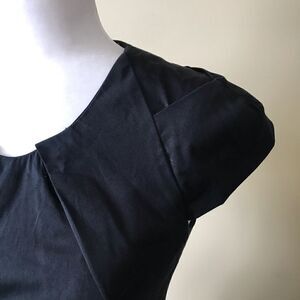 Beautiful figure-flattering and form-fitted little black dress. This capped sleeve sheath dress features origami-style seems and folded accents on the shoulders and neckline, with a banded waist and clean silhouette. Perfect for the office, cocktail party, or event, can easily be accessorized! Excellent used condition.