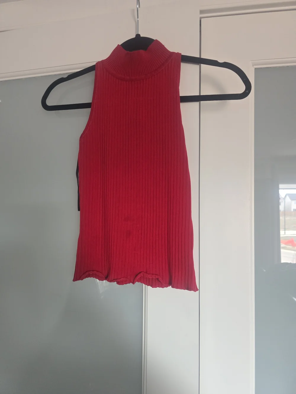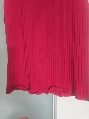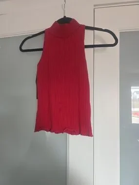 Sleek ribbed tank with a mock neckline. Stretchy knit for a fitted silhouette. Bright red shade for standout style. Easy to pair with jeans or a skirt.