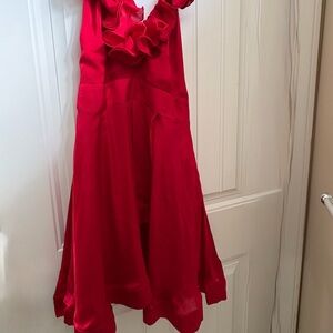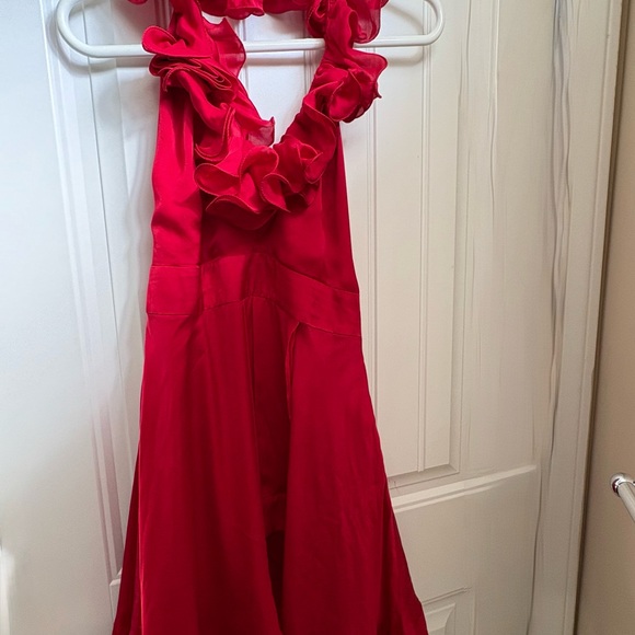 Chic mini dress with ruffled neckline. Vibrant red color. Perfect for a night out.