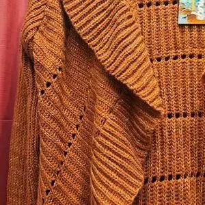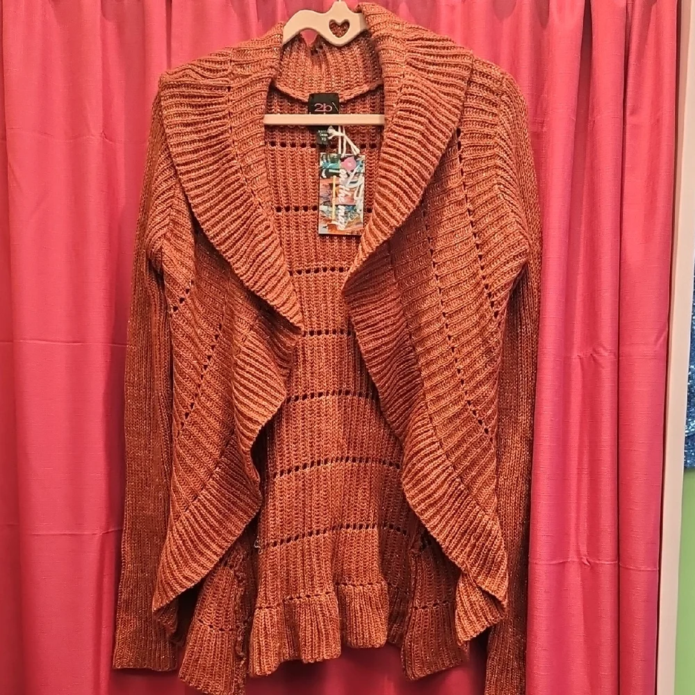 Chic open front design. Cozy knit texture. Perfect for layering. Cute rust colour with sparkle throughout. Some minor pulls in the knit but no big flaws.