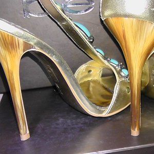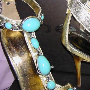 Purchased in California. Gold Metallica, Embellished with Turquoise stones with gold rhinestones. Gently used, worn twice. 5" heels. Sexy with jeans/formal events!