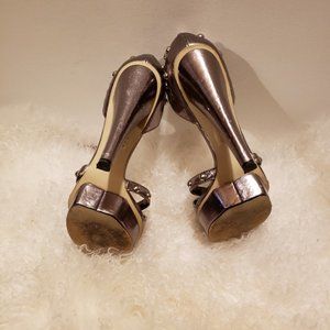 bebe silver leather high heels shoes with 5 inch heels and 1inch platform.