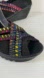Stylish black wedges with colorful woven straps. Perfect for any occasion.