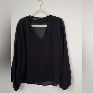 Upgrade your wardrobe with this elegant black chiffon blouse from Key. Perfect for both casual and formal occasions, this size large blouse features a sophisticated design with long, loose sleeves and a flattering V-neckline. The lightweight, sheer fabric adds a touch of grace and femininity, making it an ideal piece for layering or wearing on its own.