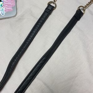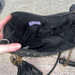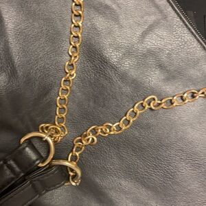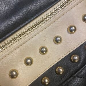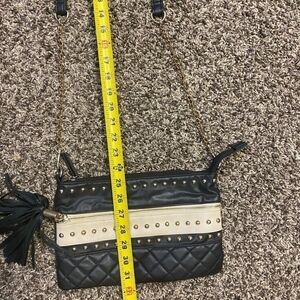 Black and cream with a part chain part faux leather strap with a black tassel to open the front pocket.