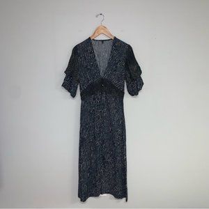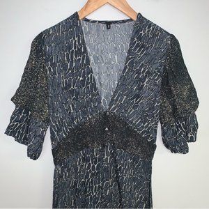 bl^nk Maxi Dress Statement Puffy Sleeves Plunging Neckline Blue Grey Size Small