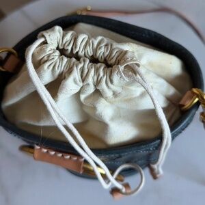 gorgeous blue green (peacock? dark teal?)leather and canvas bucket bag with diamond patch pattern and canvas drawstring closure. carry by removable, adjustable crossbody strap or big brass ring handles. some moisture marks (shown in photos) on canvas but otherwise she is like new, inside is clean without marks. approximately 6.5 inches tall and 5.25 across.