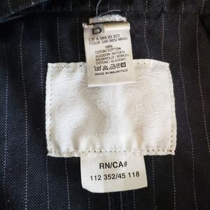 100% cotton pinstripe jacket. Hood can be tucked away into zippered pouch. Bust measures approx 16" across and length approx 26". The pinstripes are silver sparkle (hard to see in photos) Excellent gently used condition.