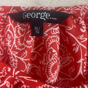 George x-large boho round neck line blouse with bell sleeves knotted hemline red, white and black print great with white pants , shorts or skirt .