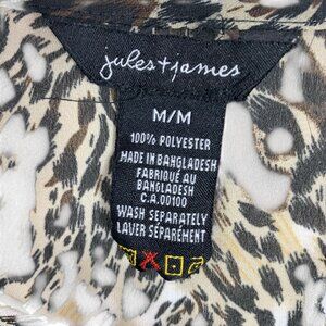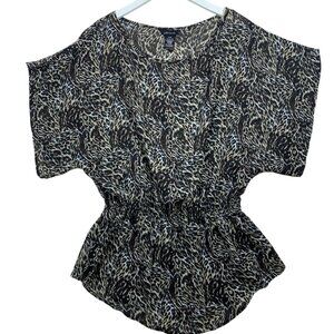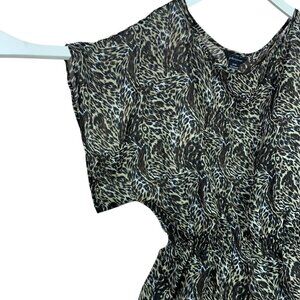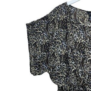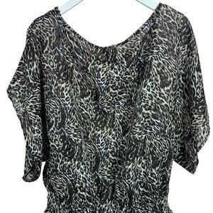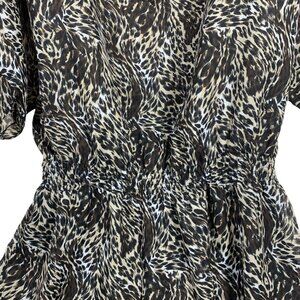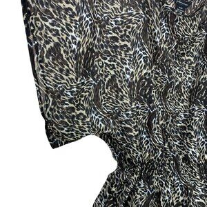black and tan abstract pattern resembling leopard or cheetah spots on a sheer, lightweight fabric. The top has a loose, blouson-style bodice with short sleeves and an elasticated waist that creates a cinched effect. The bottom portion is slightly flared