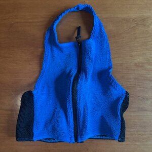 Features: Scrunched, terry fabrication; long-line silhouette; halter neck; open back; full-zipper front closure; color block front and back