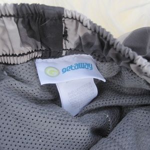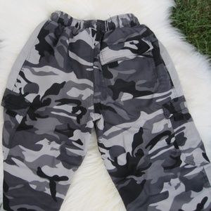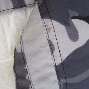 camouflage wind pants with liner, elastic waist with toggle to tighten, 2 leg pockets, 2 front pockets, 1 back pocket, small stain on lower leg as shown in pic,
