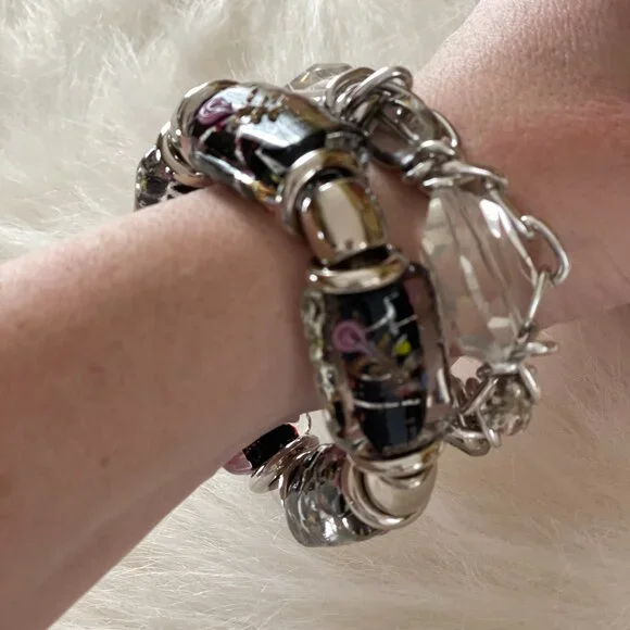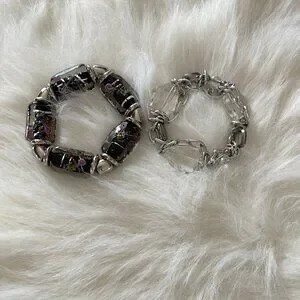 A lovely pairing of 2 stretch bracelets. I love wearing these together! The elastics are in perfect condition. Add fun and style with the hand painted black tone and lots of sparkle with the clear! Sold together as a set.