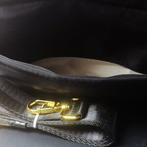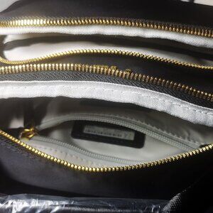 EXTERNAL FEATURES: Double-zip entry to main compartment, double-zip entry to front U-zip pocket, quick-access phone pocket with magnetic snap, top handle, removable adjustable crossbody strap, monogrammable detachable leather dangler/key ring, leather corners, 4 metal feet