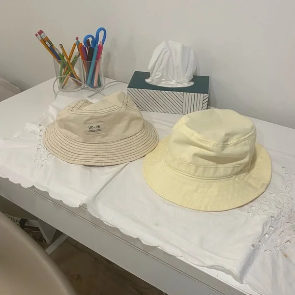 2 gently used bucket hats, like new condition! they have only been worn a few times but just not my style anymore.