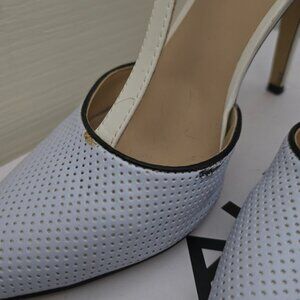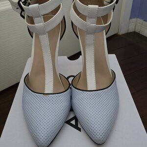 t strap heels from call it spring with pointed toe and blue colour blocking. worn twice but have minor discolourations/scuff marks on the toe.