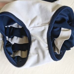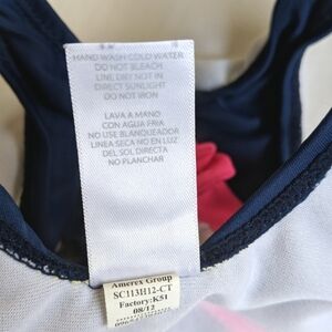 Carter's ruffle one piece swimsuit with nautical inspired navy blue & white stripes, pink bow detail.