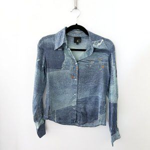this gorgeous printed button down blouse features a denim jeans pattern printed onto this lightweight silky shirt for a perfect combination of y2k meets coastal cowgirl.