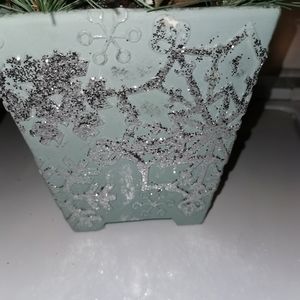 Beautiful sky blue with silver glitter square pot holding Christmas decorative, shiny balls, with evergreen and pine cones. Two sizes. Brand new tags still on, never used. Selling individually. Will take 10 dollars off tag price for each one. If you buy both together will sell both for lower price each. so extra 5. dollars off larger one.